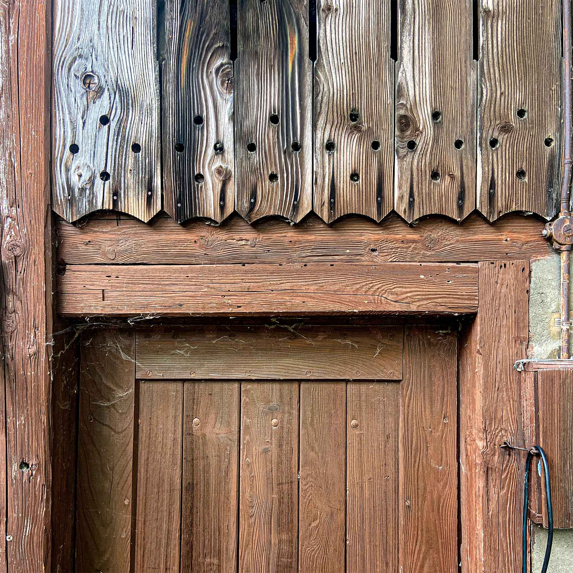 Das markante Scheunentor bildet die Adresse der neuen Wohneinheit und zeigt das neue Wohnvolumen durch eine unverwitterte Holzschalung. Die bestehenden Holzbretter der Fassade werden durch Zierungen modifiziert und sorgen so für Licht in den rückwärtigen Wohnräumen, während sie gleichzeitig vor Einblicken und Lärm schützen.